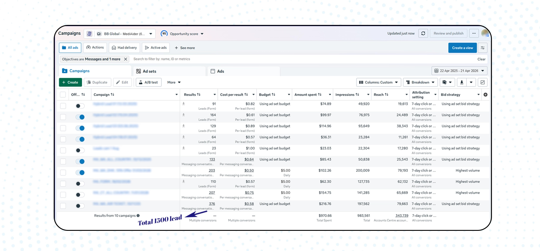 A real-time overview of our campaign performance, highlighting how structured ad optimization and targeting helped generate 1,500+ qualified leads.